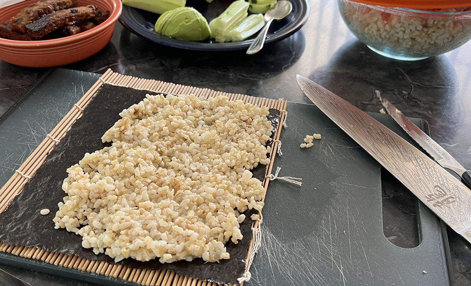 - Lay out tempeh and veggies on rice. Smear mustard or wasabi if desired. Dab a view drops of water on that inch of nori paper. Roll and squeeze the mat, starting from the side where you did NOT leave the inch of paper, and use that extra paper to "seal" the roll.