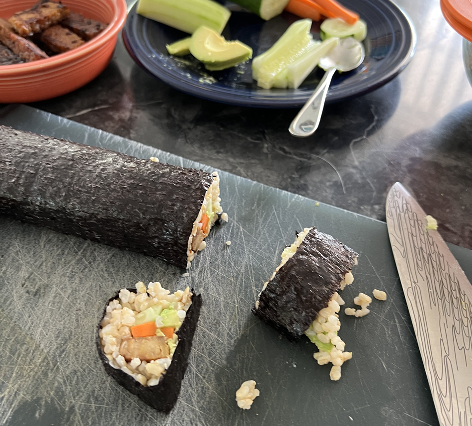 The tempeh is great any time, and it's very quick and easy. But I only had photos of the norimaki so... there you go. Back in my macrobiotic days, I rolled maki all the time cuz it was easy to eat one for dinner and then pack one for lunch the next day - especially when I was working at Periwinkle TYA and touring NYC schools. Just wrap the whole roll before cutting so it stays fresh.